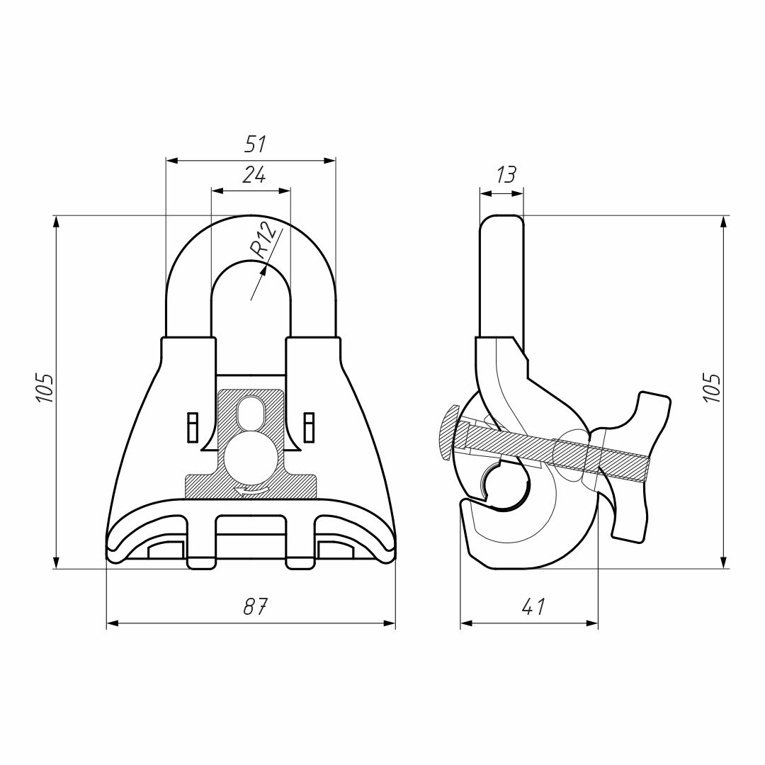 Предназначен для крепления провода СИП-2 на промежуточных и угловых опорах при углах поворота трассы ВЛ до 30°.