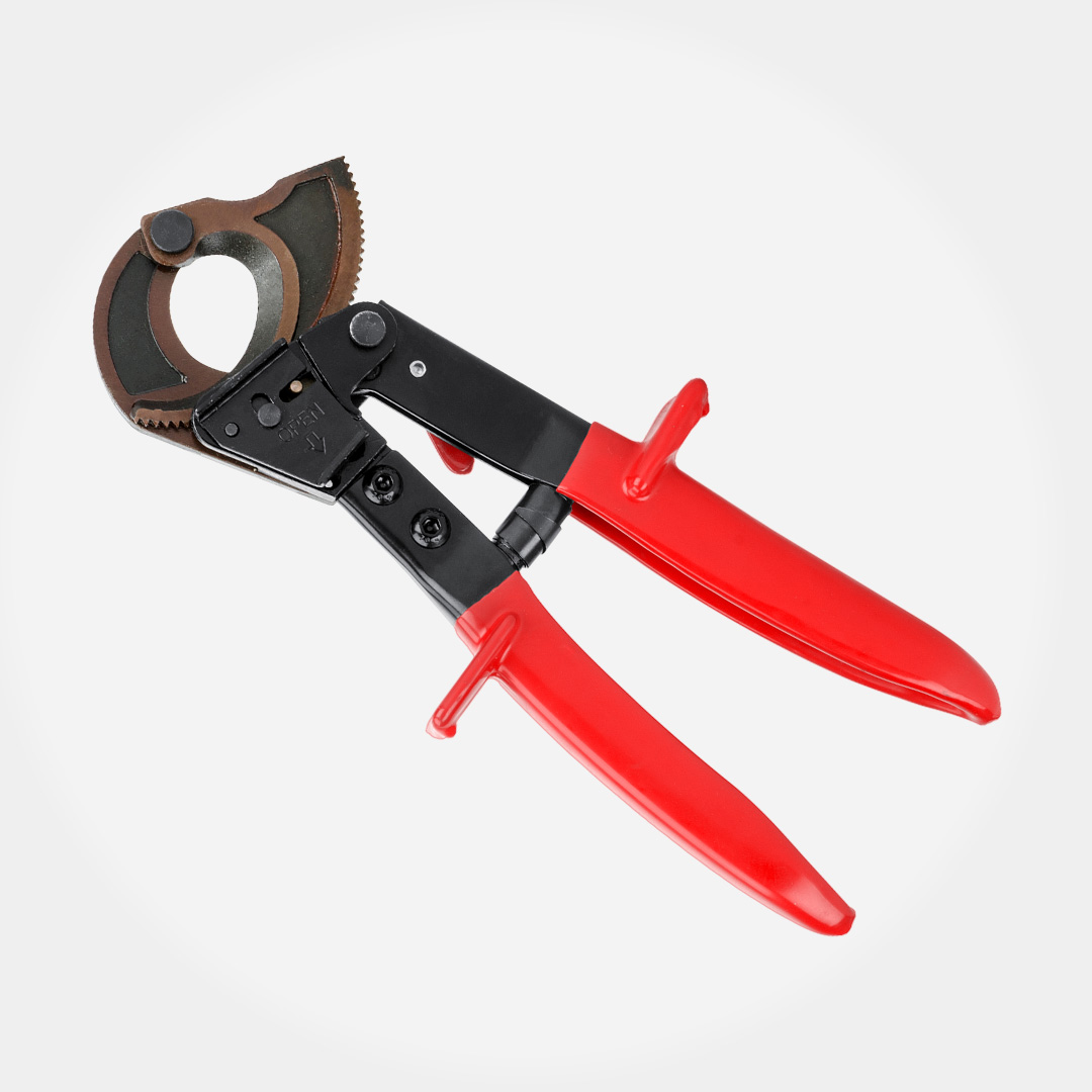- Ножницы имеют храповый механизм, что позволяет производить обрезку кабелей большого диаметра или пучка проводов при небольших усилиях.